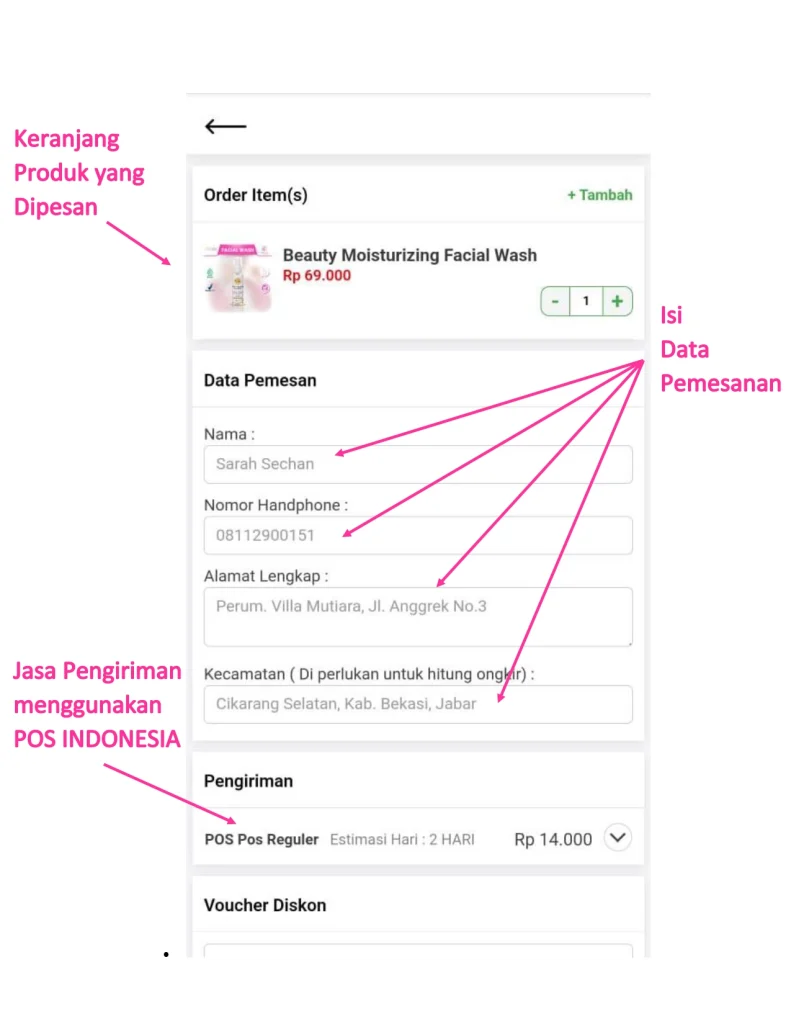 - Masukkan informasi dirimu dengan lengkap dan benar, seperti nama, nomor telepon, dan alamat pengiriman lengkap dengan Kecamatan (Diperkukan untuk menghitung ongkos kirim/ongkir).